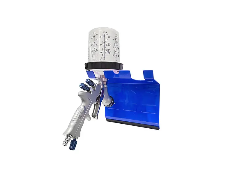 It can hold two spray guns and two air hoses simultaneously.